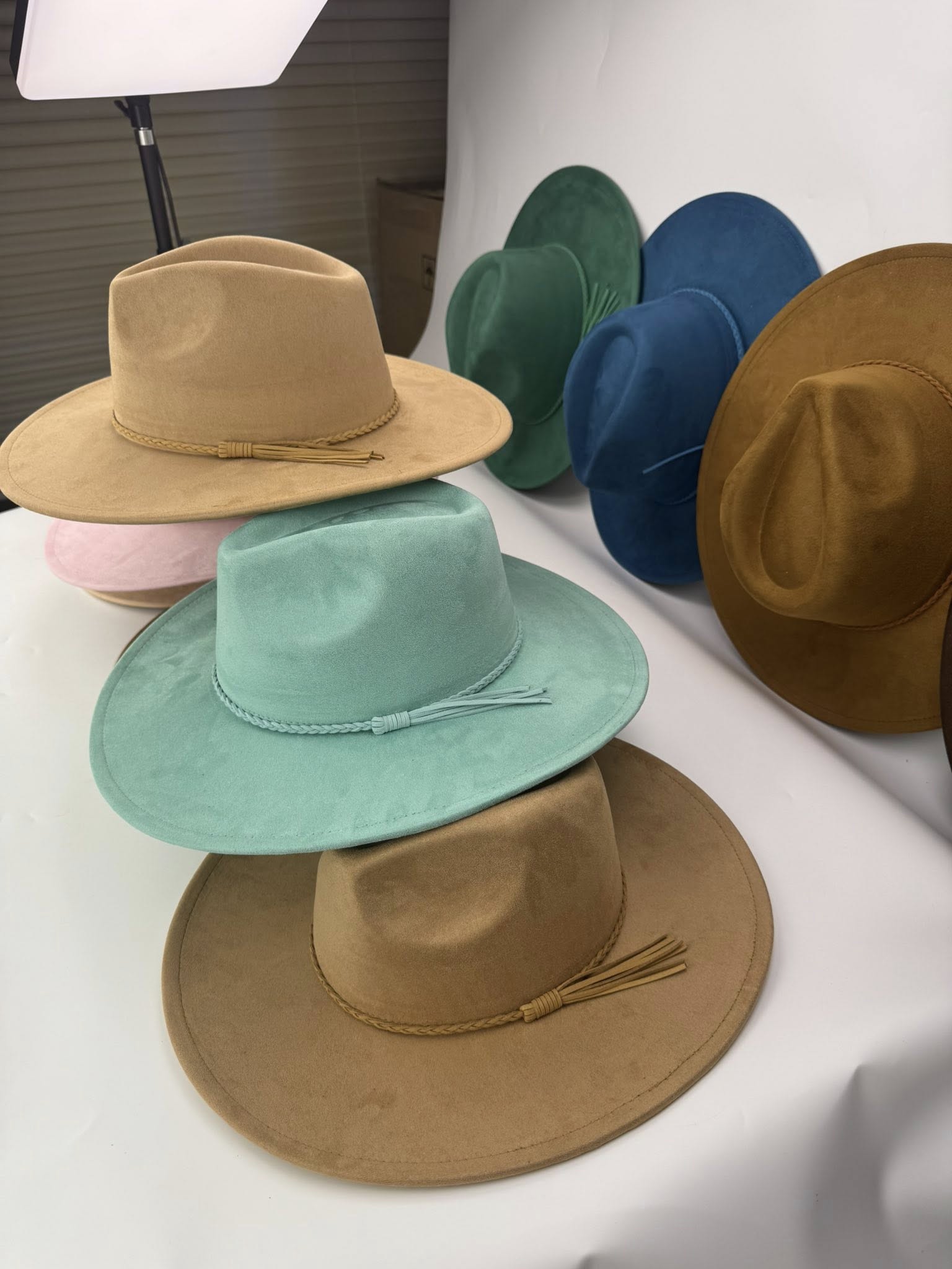 Each hat features a classic structured crown, wide brim design, and matching accent band for a clean, fashionable look. Whether you want something simple and elegant or fully customized, these hats are made to stand out.